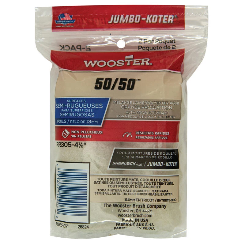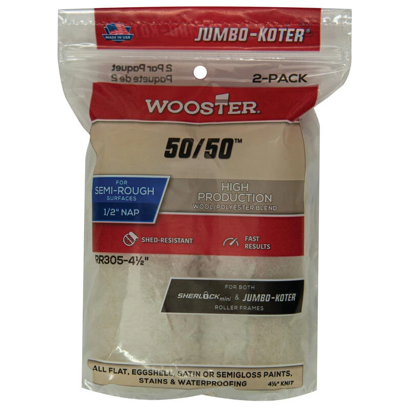 Shed-resistant, cream-colored, knit fabric blend of 50 percent lambs wool and 50 percent polyester for 100 percent performance in all flat, satin or semi-gloss paints, stains, waterproofing. Wool provides maximum paint capacity and a smooth finish polyester resists matting. For use with Wooster Jumbo-Koter system.