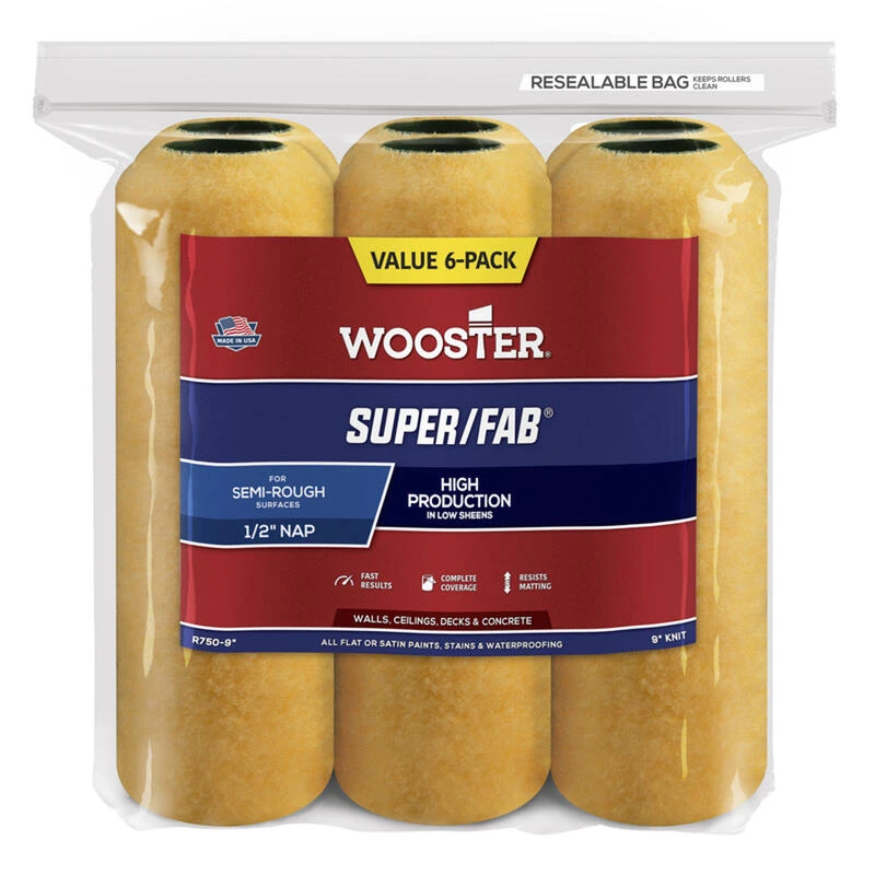 Super/Fabยฎ rollers have offered paint capacity and coverage that couldnโt be matched for over 50 years. This roller line has better resistance to matting and smoother finish capability than other knit rollers. Super/Fab has the largest selection of roller sizes and naps of any Wooster brand. Super/Fab is still the most popular cover for high-production results with all flat, eggshell and satin paints, stains and waterproofing sealers.