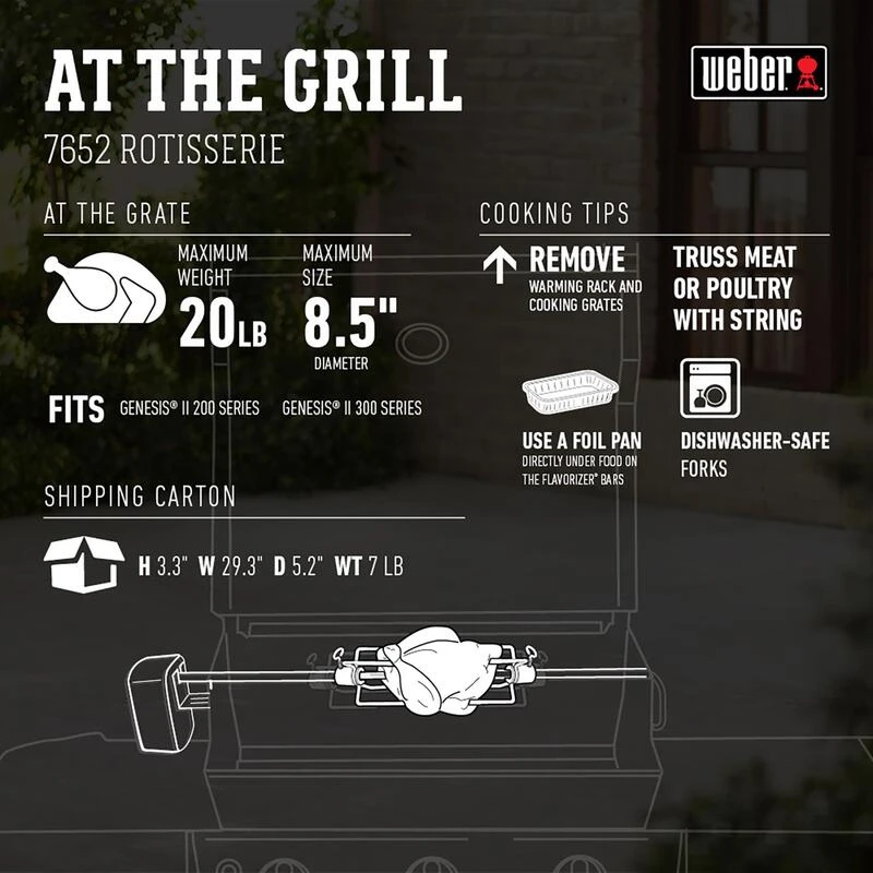 Turn your grill into a backyard rotisserie. Slow-roast a crispy yet moist whole chicken to tender ribs. The Rotisserie gently rotates food above the cooking grate, producing succulent, self-basted meat directly from your backyard kitchen.