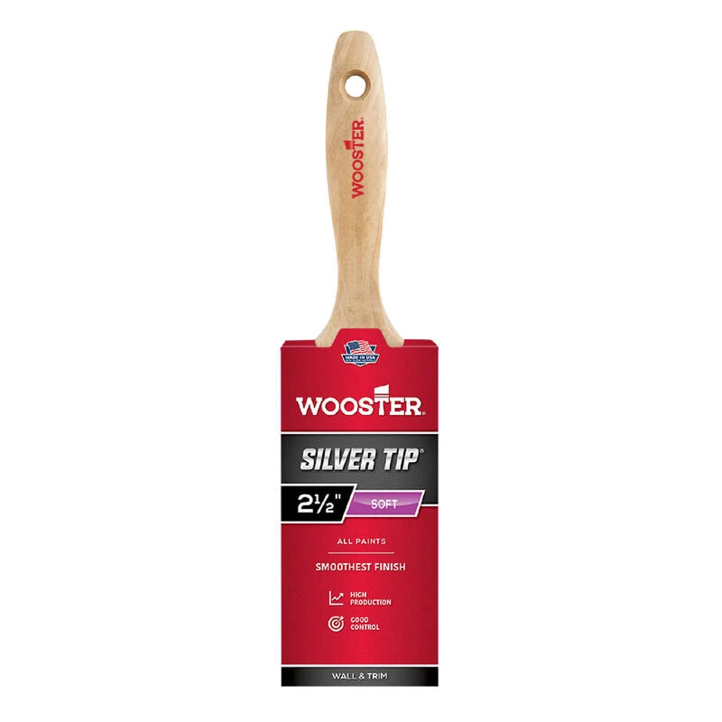 The Wooster Silver Tip brush features white and silver CT polyester filaments for excellent leveling and smoothing with all paints. Soft formulation delivers featherlike strokes virtually eliminating visible brush strokes. Durable stainless steel ferrule on a birch hardwood handle.